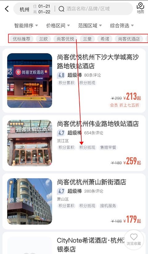 之后用户可以在上方选择酒店的品牌,也可以直接到下方选择推荐酒店。