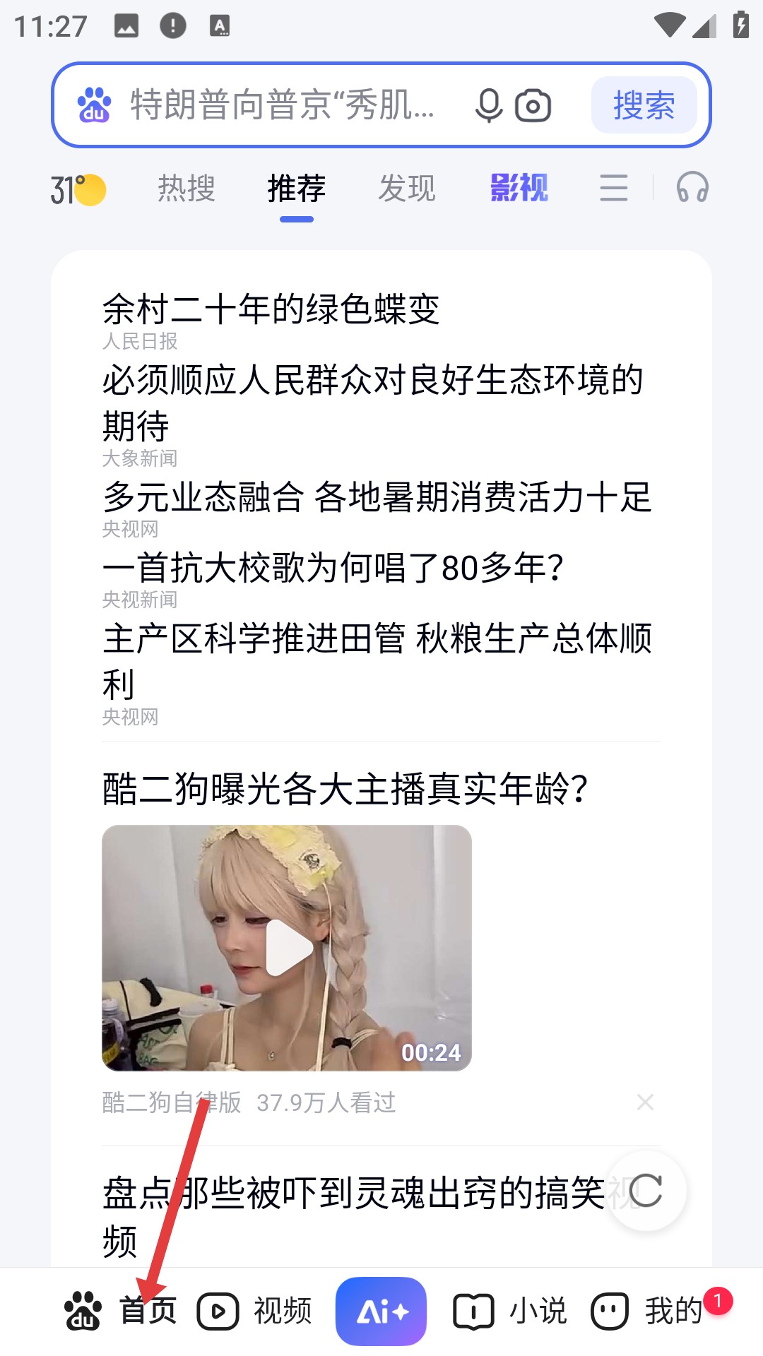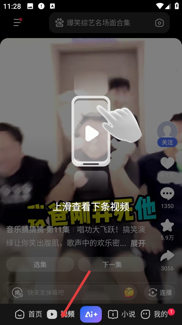 2、点击底部视频按钮进入视频板块,这里有丰富多样的视频内容,涵盖搞笑、综艺、影视等类别,播放过程中可按提示上滑查看下一条视频,享受沉浸式观看体验。