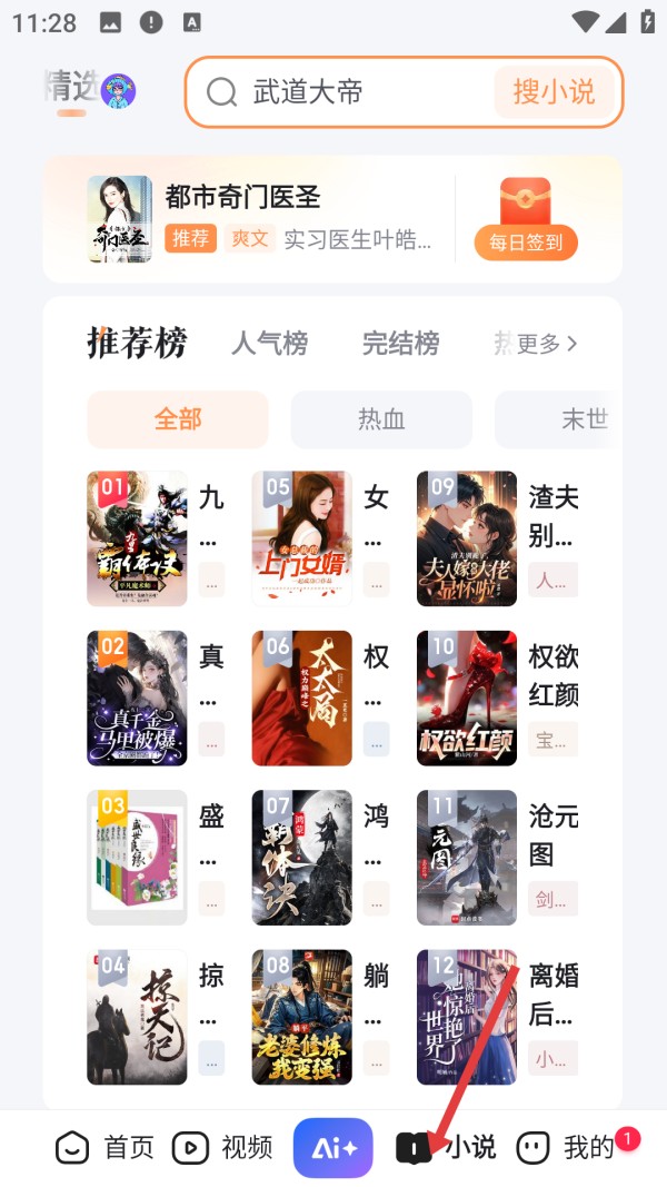 3、点击底部小说按钮进入小说频道,能看到精选小说推荐、推荐榜、人气榜等榜单,在搜索栏输入小说名可精准查找,通过签到、阅读等操作还可能获取福利。