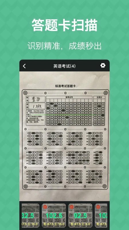 扫描答题纸,立即得到你的分数。您可以设置扫描间隔和提示音