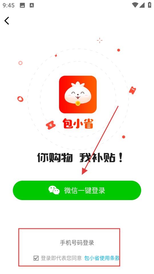 1、打开包小省APP,若弹出你购物我补贴登录弹窗,可选择微信一键登录,快速关联账号进入。