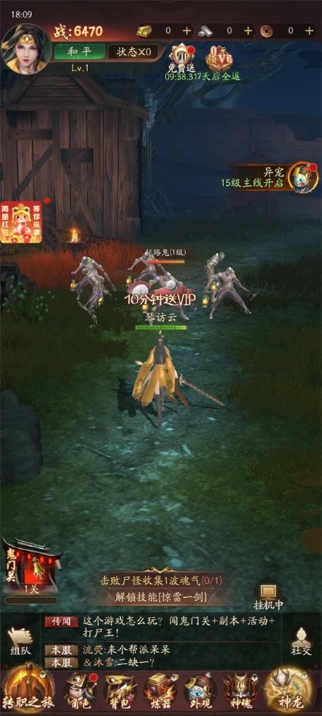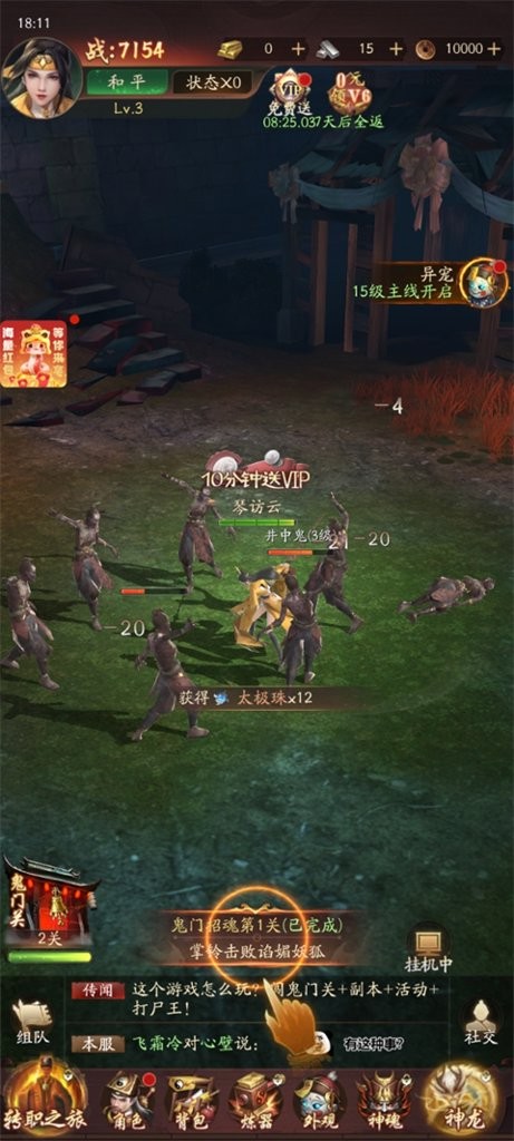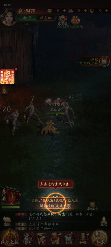 游戏开始直接开始战斗,可以打点小怪,升升级提升战力,随后完成屏幕下方的任务。