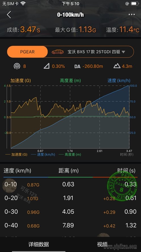 3. 直线加速测试:作为衡量汽车性能的传统测试项目,汽车职业应用程序与 PGEAR 相结合,能够精确测试诸如 0-100 公里/小时、100-200 公里/小时、0-200 米、0-400 米、60-160 公里/小时、80 公里/小时 - 5 秒、100 公里/小时 - 0 等项目。