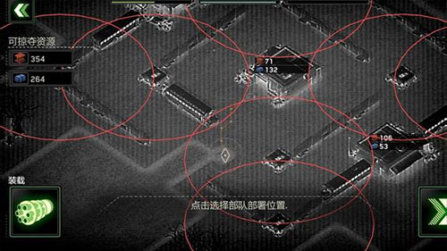 开始任务后,需要先设置『部队部署』位置,红圈内为高塔区,不能部署此处,建议观察『可掠夺资源』的周边建筑,计算每个障碍物的离资源点的距离,以及任务目标要求是什么,尽量完成目标以获取更多的资源,当然任务在前期都很好胜任,获得的宝箱可以开出5.56毫米机枪、MP5冲锋枪或是火炮等装备,以及等级经验,点击『战队图标』可查看全部武器以及设施,红色代表未获得。