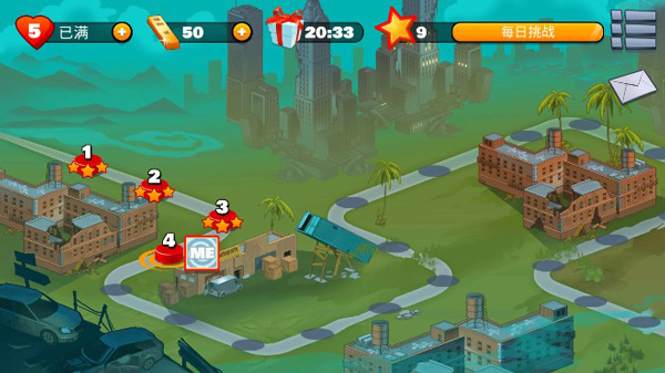 1、关卡挑战 关卡挑战中我们只能用枪这一种武器,这种武器射出去的子弹碰到障碍物会进行反弹,反弹一定次数后消失。一般关卡开始前会告诉我本关需要猎杀的僵尸的种类和数量,游戏中有三种僵尸,除了样子不一样之外其他没有任何区别,都是一枪就能干掉的,在关卡开始后需要猎杀什么僵尸,数目以及完成度都可以在屏幕上方看到,我们要做的就是尽可能的猎杀任务上的僵尸,当我们完成任务后还有剩余子弹时,就会进入加分环节,射击时只用考虑怎样射击能击杀更多的僵尸就可以了,关卡结束后根据得分的多少决定你的星级评定,最高三星。