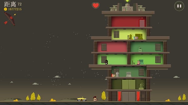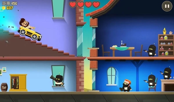 游戏中主要是以破坏建筑物为主,我们可以通过手枪、猎枪或者汽车来实现。为了物理学原理,我们的主人公一般是开汽车去横冲直撞来实现破坏效果,玩家向上滑动屏幕汽车就向上跳跃,向下自然是降落到下一个楼层了,玩家可以自行在楼层之间穿梭,而手枪和猎枪只有在打BOSS的时候才能用。