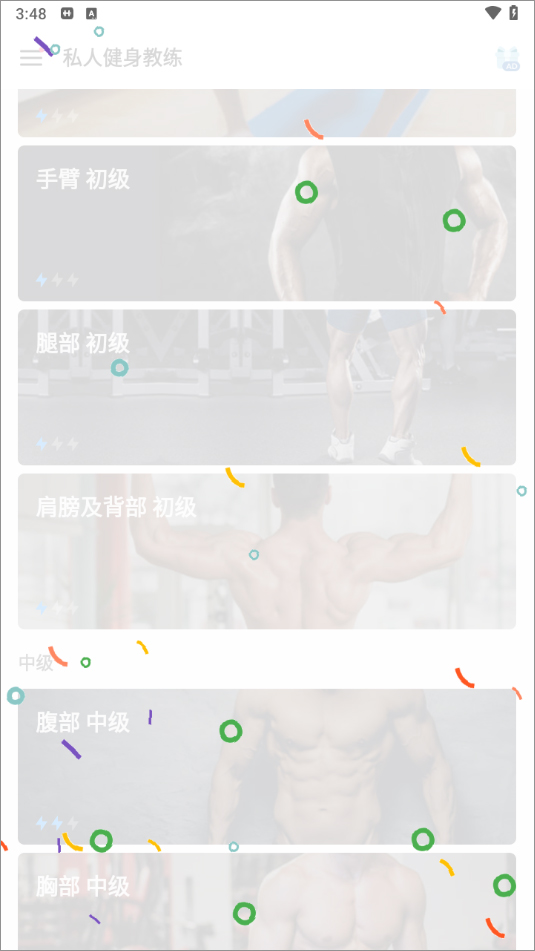 3. 这里提供了针对身体各部位的锻炼项目,包括胸部、腹部、肩部、背部和腿部。您可以从初级到高级不同的健身级别中选择,以增强您的体格。
