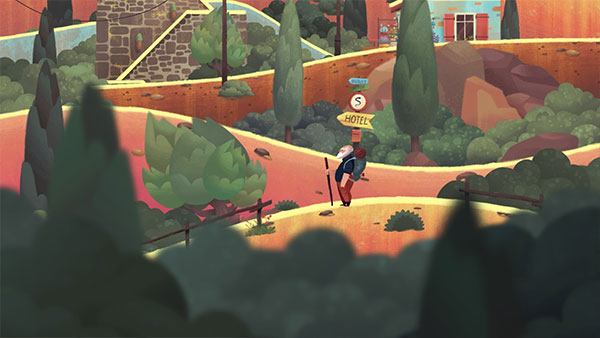 3. 前往前面的椅子处:只需点击远处的房屋,这位老人就会自动找到路线,跳过山谷,并坐在房子前面的椅子上。