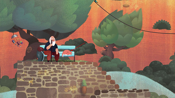 4. 触发故事的方式:点击屋檐上的这对夫妇。这对夫妇会进行一些互动,然后老人就会开始回忆起……回忆结束后,他就可以进入下一关了。