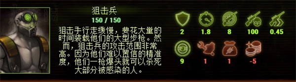 狙击兵:伤害很高,射程远,但是射速太慢,尸潮僵尸太多,无法发挥,要是以后AI可以优先攻击僵尸群里的远程僵尸和胖子,那我会出。