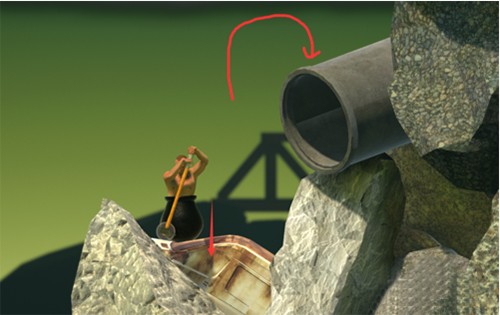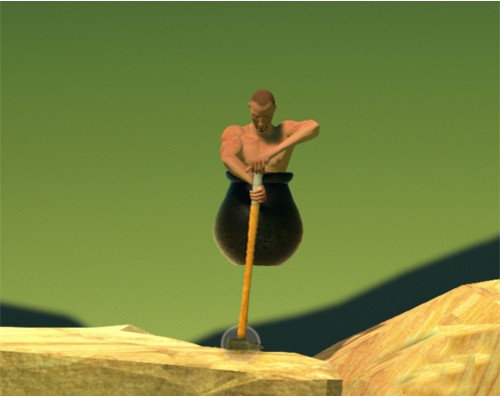 1. 这是一个非常神奇的游戏。玩家需要控制一个人在一个大水桶里,拿着锄头爬一座大山。