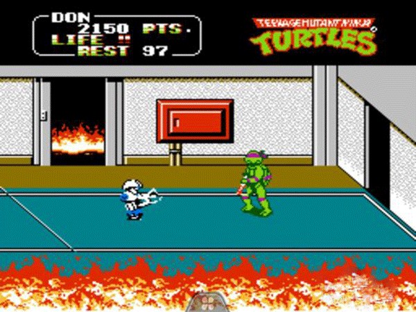 过关技巧:可以站在boss旁边然后使用普通攻击,boss在被攻击时不会攻击忍者龟,不过要注意躲避boss的子弹,一般失去两条性命就可以过关了。
