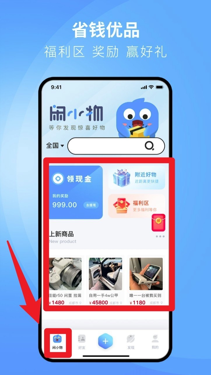 3.成功登入后,点击底部导航栏的“闲小物”图标进入主页面,页面展示福利区、精选商品、每日推荐等内容,支持分类筛选。