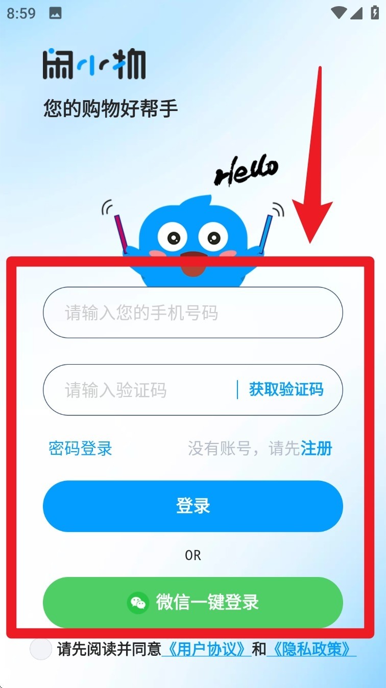 1.打开闲小物 App后,首次使用需点击“注册”,输入手机号码、验证码与邀请码(可选),勾选协议后点击“完成”即可完成注册流程。