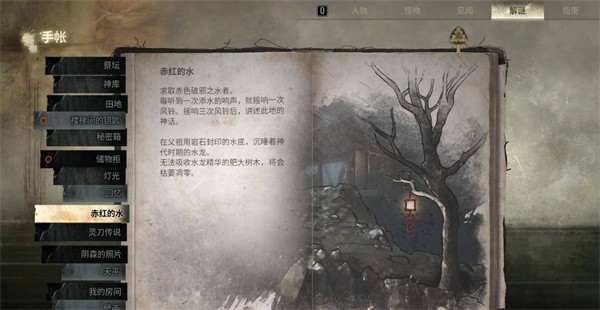 2、解开赤红的水谜题:按照符号提示依次敲响三个风铃(水边石碑附近可查看顺序)。