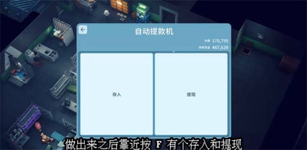 靠近ATM机后按 F键 可进行存入或提现。提现的金额将直接进入背包中,确保资金充足后,即可前往神秘商人处购买钥匙。