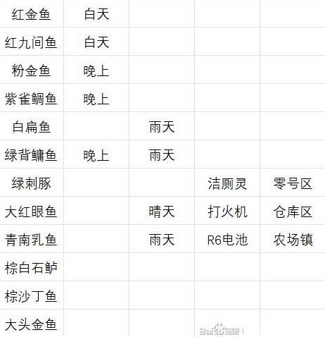 剩下的就是表格中R6电池、打火机和洁厕灵,需要对应的三种鱼时推荐使用对应的三种饵,复合的鱼饵因为泛用性太广,反而不好钓特定的鱼。