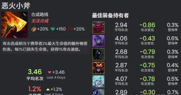 恶火小斧:攻击造成相当于携带者2%最大生命值的额外物理伤害。每1%已损失生命值,获得1%攻击速度。