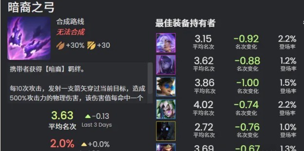 暗裔之弓:每10次攻击,发射一支箭矢穿过当前目标,造成500%攻击力的物理伤害,该伤害值每命中一个敌人就会降低33%。