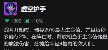 虚空护手:战斗开始时:储存25%最大生命值,并且每秒多储存2%。在阵亡时,释放相当于生命值储量的魔法伤害,分摊给半径4格内的敌人们。