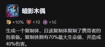 暗影木偶:生成一个复制体,且该复制体复制了携带者的各装备。复制体拥有70%最大生命值,并造成40%伤害。