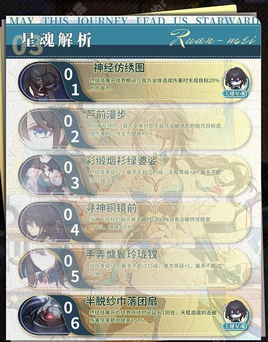 使除自身以外的队友速度提高【8.0%/10.0%】我方全体击破敌方目标弱点时,阮·梅对其造成等同于自身【60.0%/120.0%】冰属性击破伤害的击破伤害。