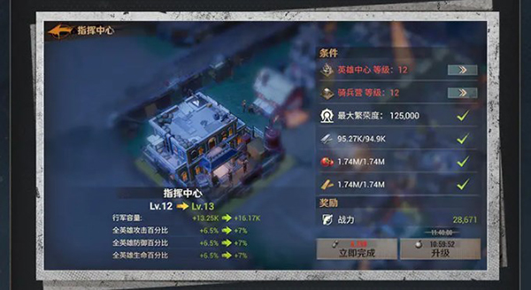 2、训练高阶士兵,或者对低阶士兵进行晋升(指挥中心达到10级解锁),都可以大幅提升战力。