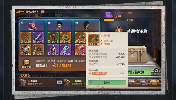 3、此外,不断提升配给中心等阶(提升物质箱开出的装备的等级上限)和物质箱等级(提升物质箱开出高品质装备的概率),都能持续优化英雄装备,提升战力。