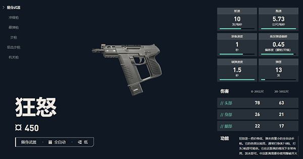 狂怒有着小骇灵之称,手枪里最快的射速可以让它短时间打出高频率的输出,但是武器的伤害确实比较低,但如果你是一个喜欢绕后跑打的选手的话,那这把枪确实还蛮适合的,这把武器的近距离的对抗能力是它最优秀的地方,不过这把武器的弹道还是需要大家去练习一番的。