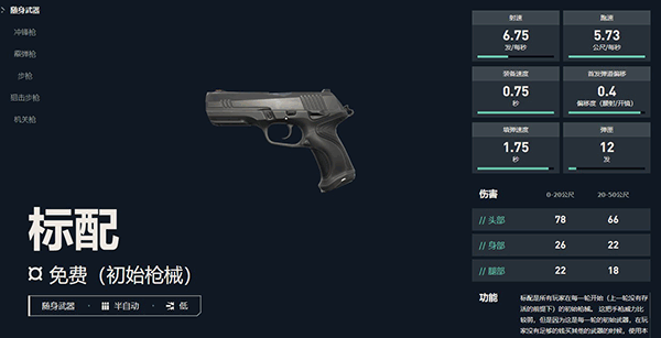 标配手枪是我们大家开始游戏就自带的枪,如果大家上轮没有存活下来,这把枪就是大家的初始枪械了,这把枪的属性偏弱,但小编悄悄告诉大家哦,这把枪在打巷战的时候还是非常不错的,甚至可以比肩手枪内的大哥正义,单点和散弹的2种不同的攻击模式让这把小手枪也是非常独特的,如果大家没有钱去购买其他的主战武器或者过度武器的话,用它来打近距离守点也是不错的选择。