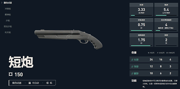 短炮是小编在eco局最喜欢起的一把武器之一,武器属性算是比较亮眼的了,2发头部一个半甲敌人可不是跟你闹着玩的,加上10发的备弹,先手秒掉对手一个咱就可以更换别人更好的武器了,当然大家预瞄能力不错的情况下用这把武器打拐角的敌人也是不错的选择,加150的超低价格,简直不要太划算,不过大家可别用它去和远距离的敌人对枪哦。