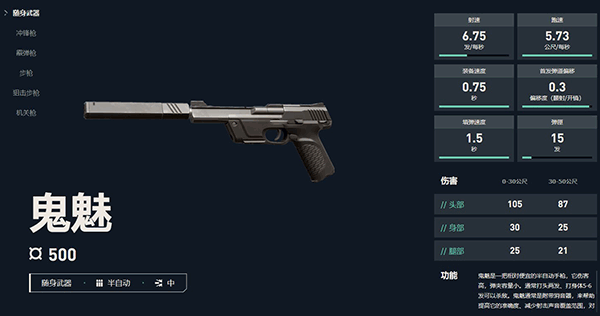 比起鬼魅,小编还是更喜欢叫它usp(小编在入坑前一直在玩csgo咳咳咳)这把游戏有着与CSGO中的usp消音相似的属性以及手感,30码点头直接击杀无甲敌人的属性让我们都爱不释手,如果小编选择的是烟位或者是决斗者的话大概率都会选择这把枪作为eco局的武器,稳定的弹道也让小伙伴们很容易用这把枪造成击败,是一把出色的手枪。